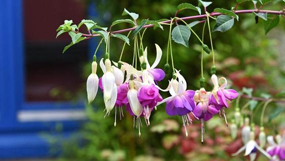 丁度、このフクシアの向こうに、青い窓枠の家があり、それを背景に撮りましたが、補色の効果で花がとてもきれいに写りました。